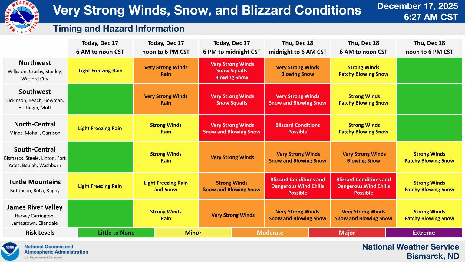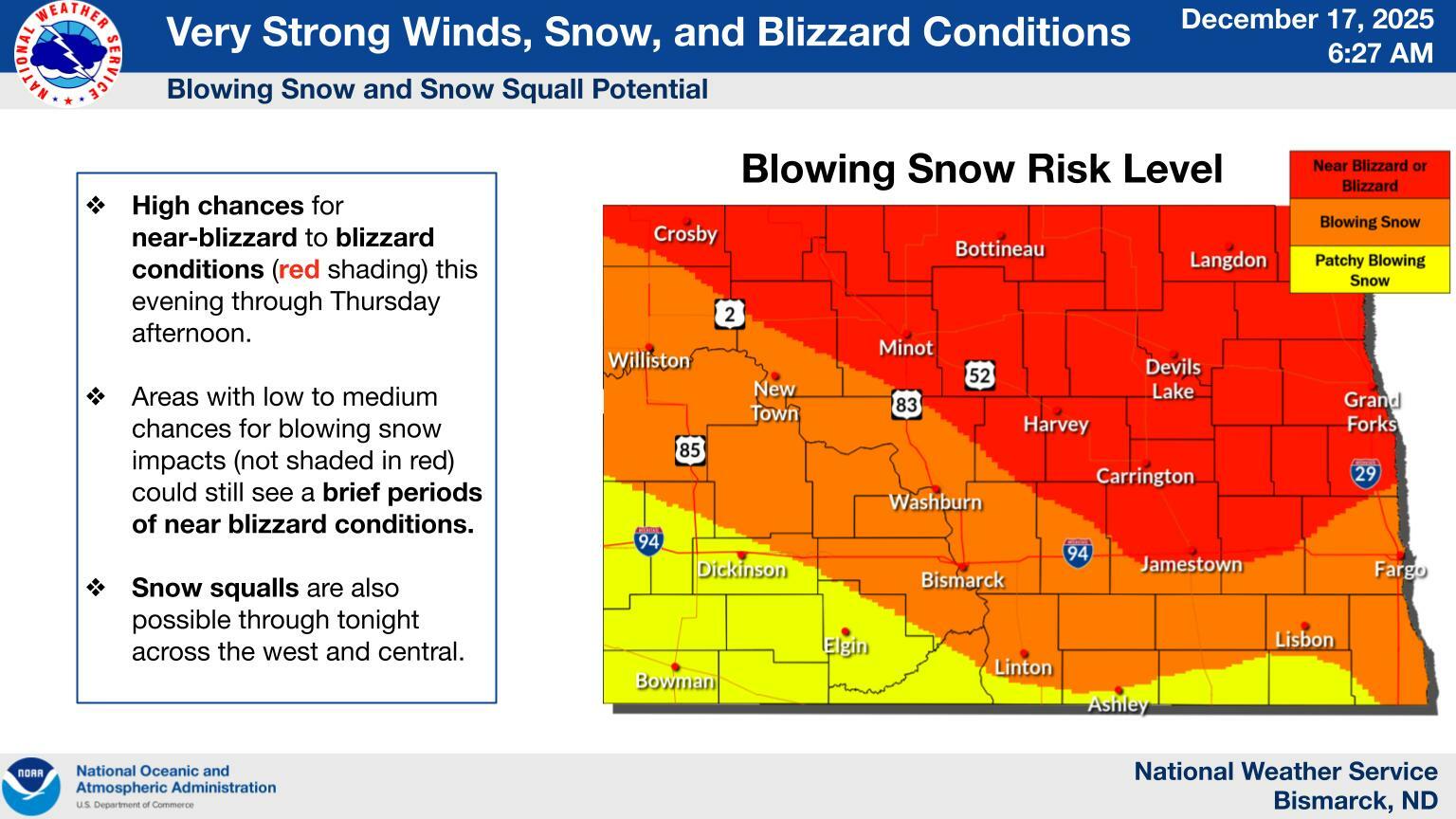 All travelers are encouraged to monitor road conditions as weather conditions occur. For road information, call 511 from any type of phone or go to the Travel Information Map at www.dot.nd.gov. Motorists should check surrounding states for their current road condition information.
